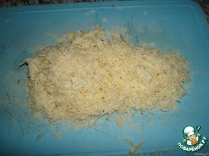 • Через 20-30 минут вынуть противень с картофелем из духовки и положить рыбу на дно противня так, чтобы картофель с грибами был вокруг рыбы. Оставшимся маринадом полить сверху. Добавить часть сыра и отправить в духовку.