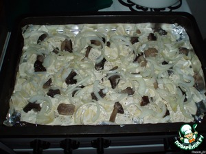 • Пока горбуша маринуется, приготовим начинку. Для этого картофель нарезать небольшими пластиками, перемешать с майонезом и выложить на противень. Сверху положить грибы и порезанный кольцами лук. Посолить, поперчить. Отправить в разогретую духовку на 20-30 минут.