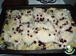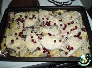 За 5-10 минут до окончания приготовления вынуть противень и засыпать рыбу оставшимся сыром. Добавить бруснику или клюкву (у меня была клюква), которая и является изюминкой этого блюда.