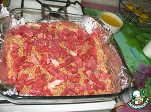 Дно емкости для запекания выстелить фольгой (так не подгорает), полить фольгу растительным маслом, рассыпать по ней гречку.