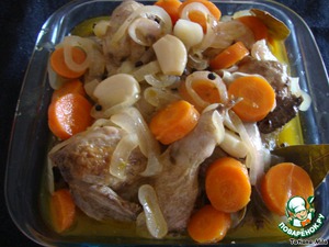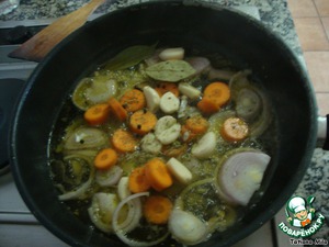 Переложить птицу на тарелку, на том-же масле обжарить до золотистого цвета крупно порезанный лук, морковь, чеснок (очишенный, целыми зубчиками), лавровый лист, перец, гвоздику и орегано. Добавить уксус, проварить 5 минут.