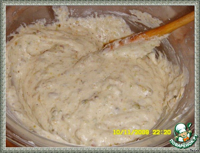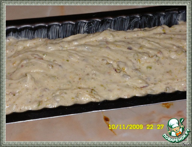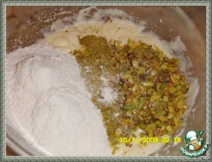 Муку, крахмал и разрыхлитель просеять. В кремообразную сливочную массу всыпать муку и молотые и рубленные фисташки,
