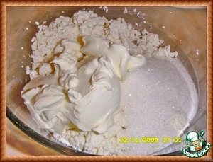 300 г творога (брать жирный творог) провернуть в блендере с 100 г сахара, 200 мл сметаны 20%, -