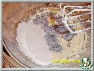 Просеиваем вместе 3 раза муку, соль и пекарский порошок. Смешиваем масло с мукой и маково-молочной смесью, разделив муку на 3 части, а маковую смесь на 2. Начинаем с муки, затем мак и т. д. Смешиваем аккуратно, чтобы сохранить вбитый в масло воздух.
