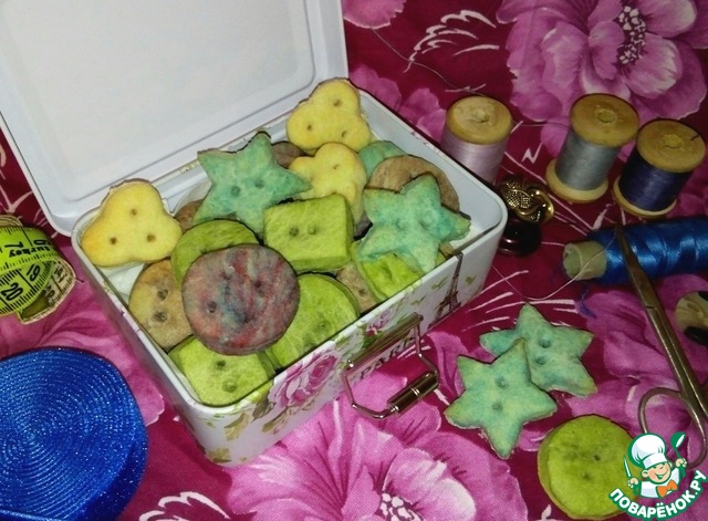 Духовку нагреть до 180-200*С – смотрите по своей духовке. Раскатать тесто до толщины 3 мм – не переборщите, слишком тонкое делать не надо. Вырезать из пласта пуговки разных размером и формы – кружки, ромбики, цветочки – если у вас есть такие небольшие выемки. Выложить на противень. В серединках сделать круглые вмятинки и просверлить дырочки (2, 4 штуки) китайской палочкой.
