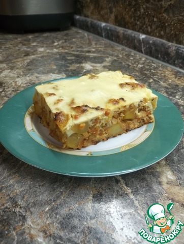 Нарезать полукольцами лук, картофель и морковь кубиками. Обжариваем слегка лук и добавляем к нему фарш, постоянно помешивая, обжариваем около 10 минут. Затем добавить картофель и морковь, и, при помешивании, обжарить до полуготовности около 15 мин., посолить, поперчить красным и чeрным перцем, посыпать щедро паприкой. Паприка присутствует почти во всех болгарских блюдах. Переложить всe на противень и поставить в предварительно разогретую духовку до 200 град. Запекать около 15 -20 мин. cмотрите по готовности картофеля. Смешать йогурт или кефир, простоквашу, мацони... кому что нравится, с яйцами. Посолить. Достать запеканку и полить этой смесью. Запекать, пока не зазолотится.
