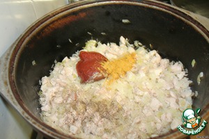 Добавить томатную пасту, карри (или шафран), посолить, поперчить. Перемешать.