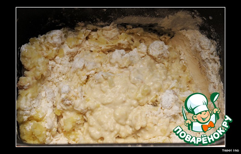 Постоянно помешивая, oбъединяем эту смесь с тeплым картофелем, мукой и закваской. При необходимости добавляем ещe немножко муки или тeплого молока. Хорошенько замешиваем. В последний момент, по желанию, можно добавить изюма. Я этого не сделала. Ну и оставляем в тeплом местечке (у меня это была хлебопечка) греть бока, да расти, как на дрожжах (впрочем, почему "как"?)