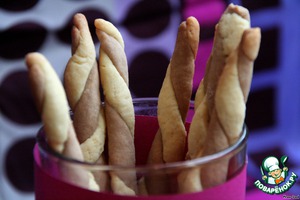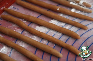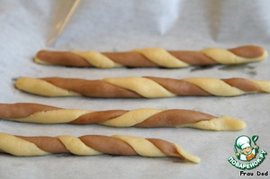 Вынуть тесто из холодильника. Духовку разогреть до 190 градусов, противень выложить пергаментом. Скатать из белого и коричневого цвета небольшие шарики, раскатать их в колбаски.