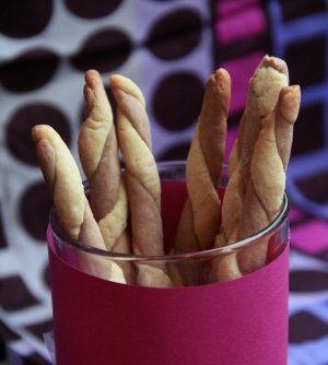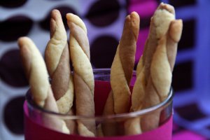 Переплести вместе 2 цвета, чтобы получились косички. Выложить на противень, поставить на 15 минут в духовку.