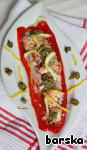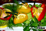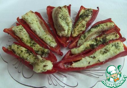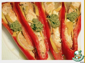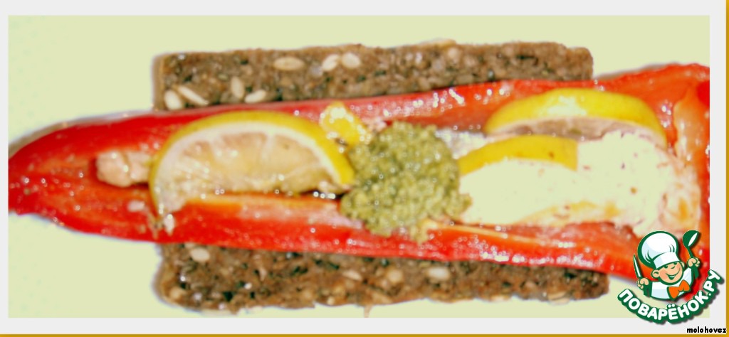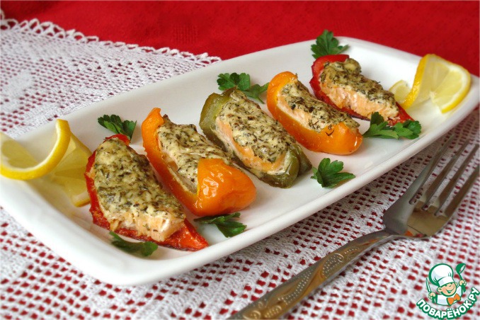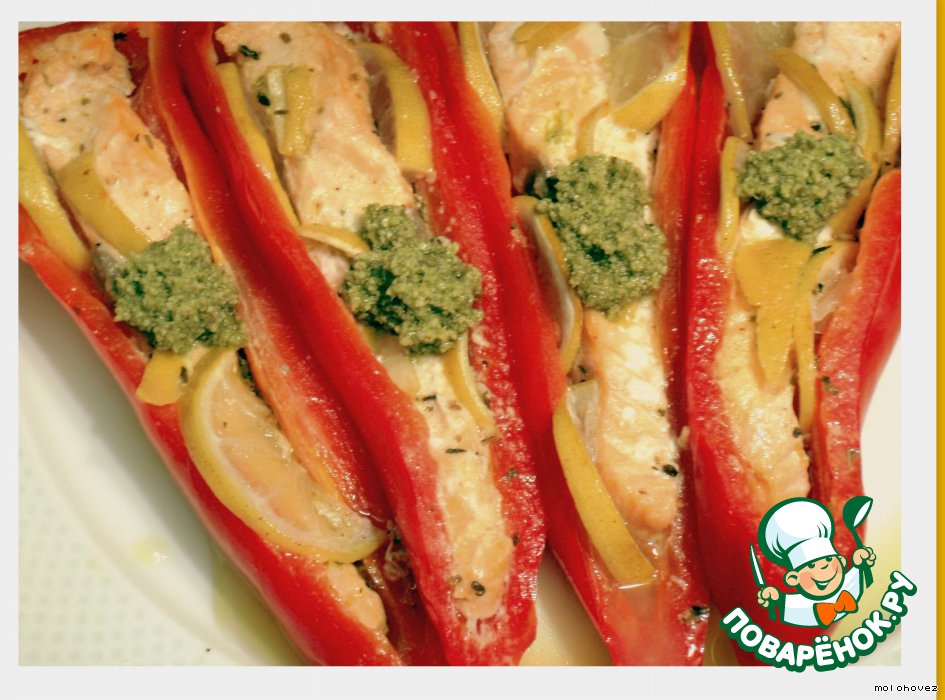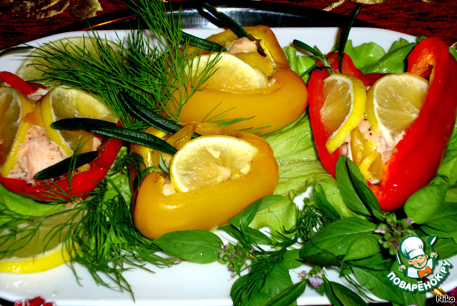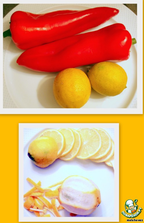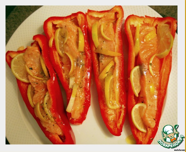 Вложить по 1 полоске филе рыбы в каждую половинку перца, как в лодку (!!!) и украсить полукольцами лимона. Сверху выложить нарезанную цедру.