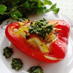 Аккуратно выложить на блюдо и украсить сверху ложечкой зеленого песто.