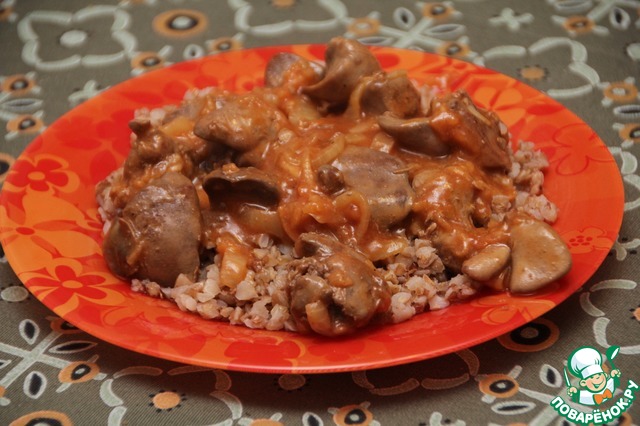 В воде размешиваем томатную пасту, вливаем к желудочкам. Немного потушится - выкладываем гречку. Все перемешиваем, добавляем специи.