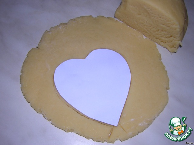 2. Раскатать тесто толщиной 2-3 мм, вырезать формочкой печенья -"сердечки". У меня формочки нет, поэтому я вырезала "сердечки" по бумажному тафарету.