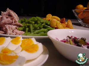 [b]Подготавливаем ингредиенты:[/b] холодный картофель режем кусочками и обжариваем в ложке растительного масла до румяной корочки, скумбрию разбираем на ломтики и, если требуется, освобождаем от кожицы и косточек, спаржевую фасоль режем на кусочки и отвариваем, яйца отвариваем, чистим и режем на четвертушки.