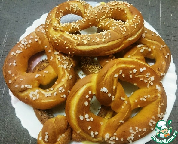 Я часто путешествую по Германии - очень люблю эту страну и была в ней большое количество раз. В январе этого года довелось слетать все семьей, включая 9 -месячного на тот момент Тимоху. Наш папа основательно подсел на брецели. Брецель - это кренделeк с крупной солью, иногда с сыром или маслом. Очень жалела, что с собой их не довезти - сохнут и становятся дубовыми. Нашла на днях в одном из журналов рецепт, приготовила и ахнула - вот же они, настоящие брецели. Решила выложить, но нашла уже имеющийся рецепт у Hyazinthe. Внимательно изучив, заметила отличие в составе теста - у меня чуть упрощенный вариант, поэтому делюсь тем, что имею. Брецелей много не бывает!