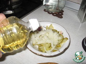 Огурцы лучше всего использовать просто соленые -бочковые. Подойдут любого размера Порезать их ломтиками как можно тоньше