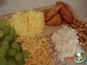 • Трем виноград на терке, сыр, желток. Укладываем все по очереди.