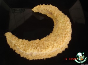 • Трем грудку на терке, орешки перемолоть в блендере, все смешать с майонезом(1 ст.л.), перемешать и уложить в форме полумесяца.