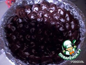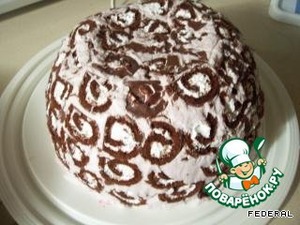 Потом берём этот торт и кладём в шоколадный крем, осторожно, и опять в холодильник на часика 4, после этого вынимаем, переворачиваем на блюдо и украшаем по своему вкусу.