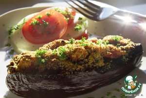 4. Перемешайте мякоть баклажанов с окороком и цукини и наполните половинки баклажанов. Полейте соусом, посыпьте крошками хлеба, смешанными с остатками сыра, и зеленью.
