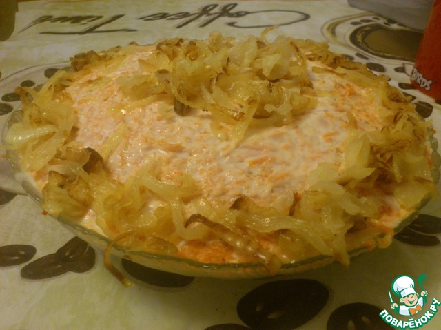 Обильно смазываем получившийся салат майонезом. Лук нарезаем кольцами и обжариваем на сливочном масле на среднем огне до золотистого цвета, подсаливаем. Остывший лук аккуратно выкладывам на салат и ставим в холодильник на 5 -6 часов (чтоб пропитался). Я всегда делаю его поздно вечером и оставляю в холодильнике на ночь.