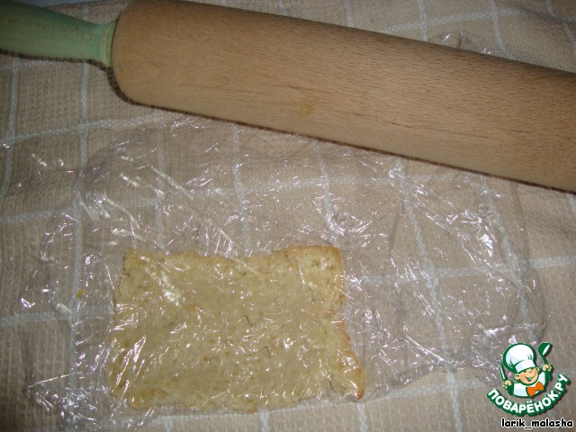 Положить полученный кусочек на пленку и сверху также покрыть пленкой. Раскатать хлеб тонко скалкой, чтобы кусочек стал плоским.