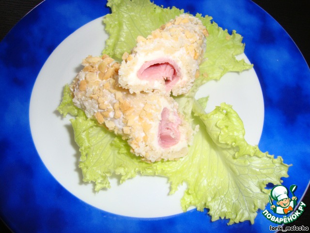 • Сверху выложить ветчину. Или кусочек филе копченой рыбы (по вашему желанию).