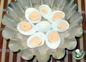 Вареные яйца очистить от скорлупы и разрезать пополам.