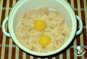 Вбить яичные желтки, посолить немного, поперчить и разделить смесь на 3 равные части