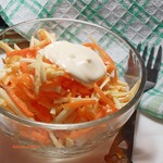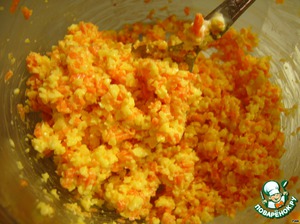 Затем все не менее просто: сыр и морковь по-корейски (приготовленную по вашему любимому рецепту или купленную в ближайшем маркете) отправляем в измельчитель-блендер. И через несколько секунд получаем оранжево-желтую крошку. В нее добавляем майонез или сметану (по вкусу). Смесь должна быть не жидкой, только чтобы стать однородной.