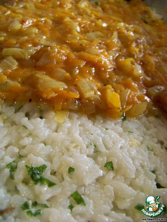 Начинаем выкладывать слои: половину риса, сверху лук с морковкой -