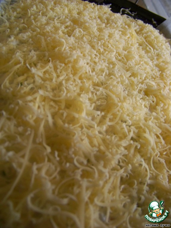 Верх обмазываем сметаной, посыпаем тёртым сыром