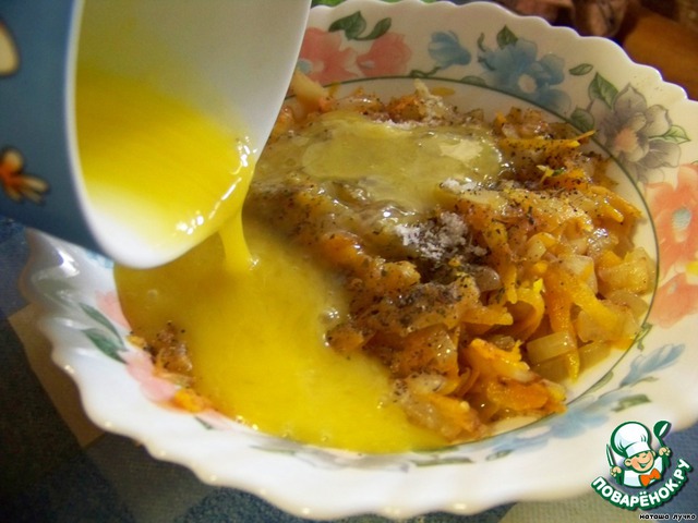 Отделяем белки от желтков и смешиваем желтки с остывшими луком и морковью -