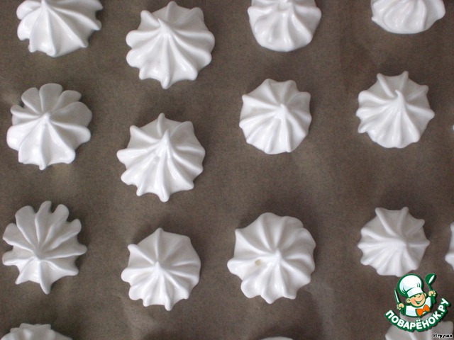 На застеленный пергаментом противень кулинарным шприцом отсадить маленькие безе.