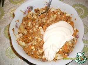 добавить в салат. Все вымешать, поперчить и заправить майонезом.