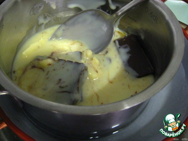 Растапливаем шоколад, смешанный со сгущенным молоком на "водяной бане",