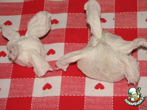 Все специи разделить на 2 части - одна для взрослого спиртного напитка, другая для детского. Из марли, сложенной в 2 слоя, вырезать 2 небольших квадрата (10х10 см) и положить в них наши специи (палочку корицы поломать, а от мускатного ореха натереть небольшую часть - на кончике ножа).