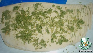 Потом берем и прикрываем нашу начинку (как книжечку закрываем) пустой половинкой теста. Сверху выкладываем оставшуюся начинку и немного приминаем руками ее к тесту (это для того, чтоб она меньше рассыпалась)