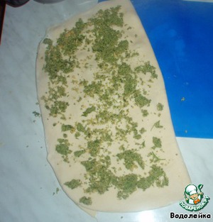 Подошедшее тесто переложить на стол (посыпать мукой) и раскатать его в прямоугольник. Растопить сливочное масло и смазать маслом раскатанное тесто.