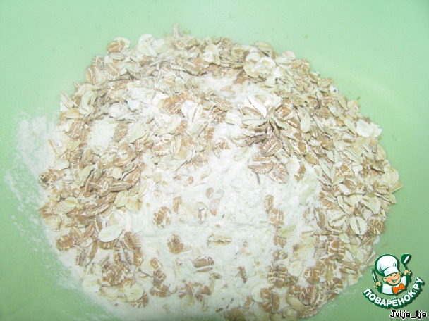 Итак, для начала нужно смешать все сухие ингредиенты. Муку (неполный стакан, оставляем немного для присыпания рабочей поверхности. Муку не просеиваем), овсяные хлопья, соль.. -