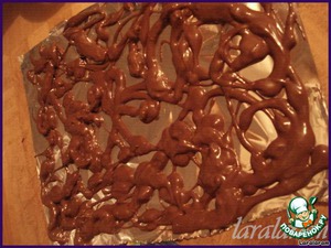 Шоколад растаял? Хорошо, прокалываем дырочку в уголке мешочка (или уголочек срезаем ножницами) и начинаем рисовать шоколадом узоры... я так просто водила хаотично - получилась такая сетка просто. Кладём в морозилку, даём застыть. -