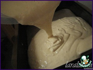 Выливаем в форму. Обычно дно или застилаем бумагой или промасливаем, а вот с боками такое дело: если не хотите, чтоб бисквит поднимался бугорком посредине - то бока формы ничем не надо смазывать...