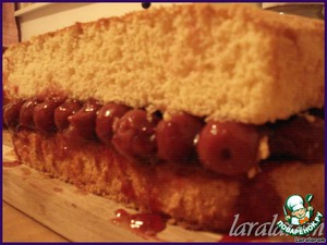 На нижний бисквит кладём вишни вместе с желе, если желе останется, то зальёте вишни сверху...