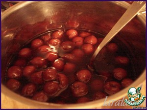 Вишню отцеживаем, вишнёвый сок (должно быть 0,5 л, если не хватает - долить) слегка подогреваем.