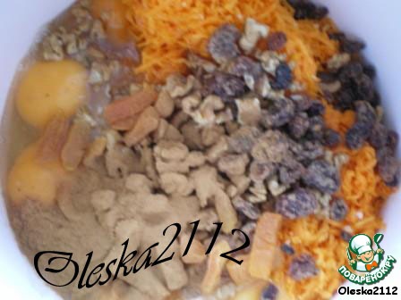 • Добавляем яйца, грецкие орехи (измельчённые), изюм, курагу (порезать), мускатный орех и корицу. Всё тщательно перемешиваем.