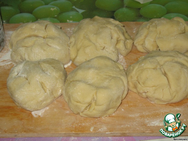 Затем добавить муку и соду (соду лучше погасить уксусом). Замесить тесто. Разделить его на кусочки. У меня получилось шесть.