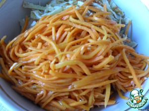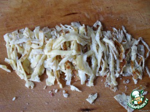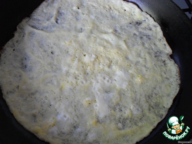 Из яиц, молока и масла приготовить омлетный блинчик, охладить и нарезать соломкой.