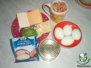 Вот наши все продукты. У меня было два вида сыра 100г. твердого и 100г плавленого. Их тунца слить жидкость, авокадо почистить.