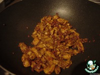 Добавляем курочку вместе с соусом. Обжариваем до золотистой корочки.